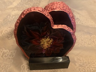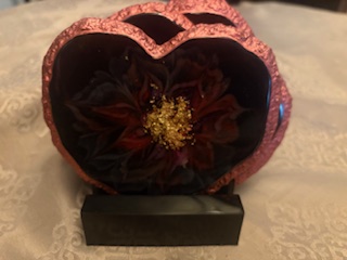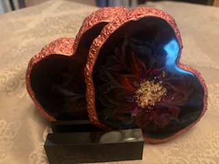 Add a touch of romance and elegance to your table with this stunning handmade resin coaster set. Shaped like hearts, each coaster features a gorgeous deep floral bloom with shimmering golden accents set against a glossy finish. The set comes with a matching decorative holder, making it both functional and eye-catching.