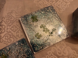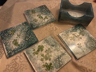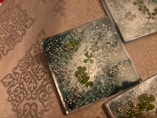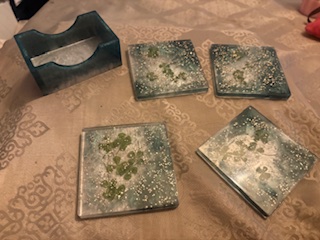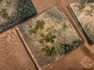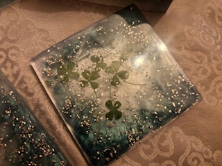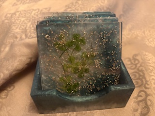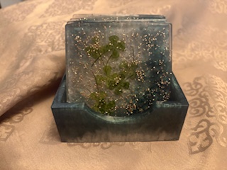 Bring a touch of luck and natural beauty to your table with this handmade resin coaster set, featuring real pressed clover leaves suspended in a dreamy blend of shimmering teal, white, and silver tones. Each piece is one-of-a-kind, blending the elegance of resin art with the charm of nature. The set includes 4 square coasters and a coordinating holder for a complete, functional, and decorative set.